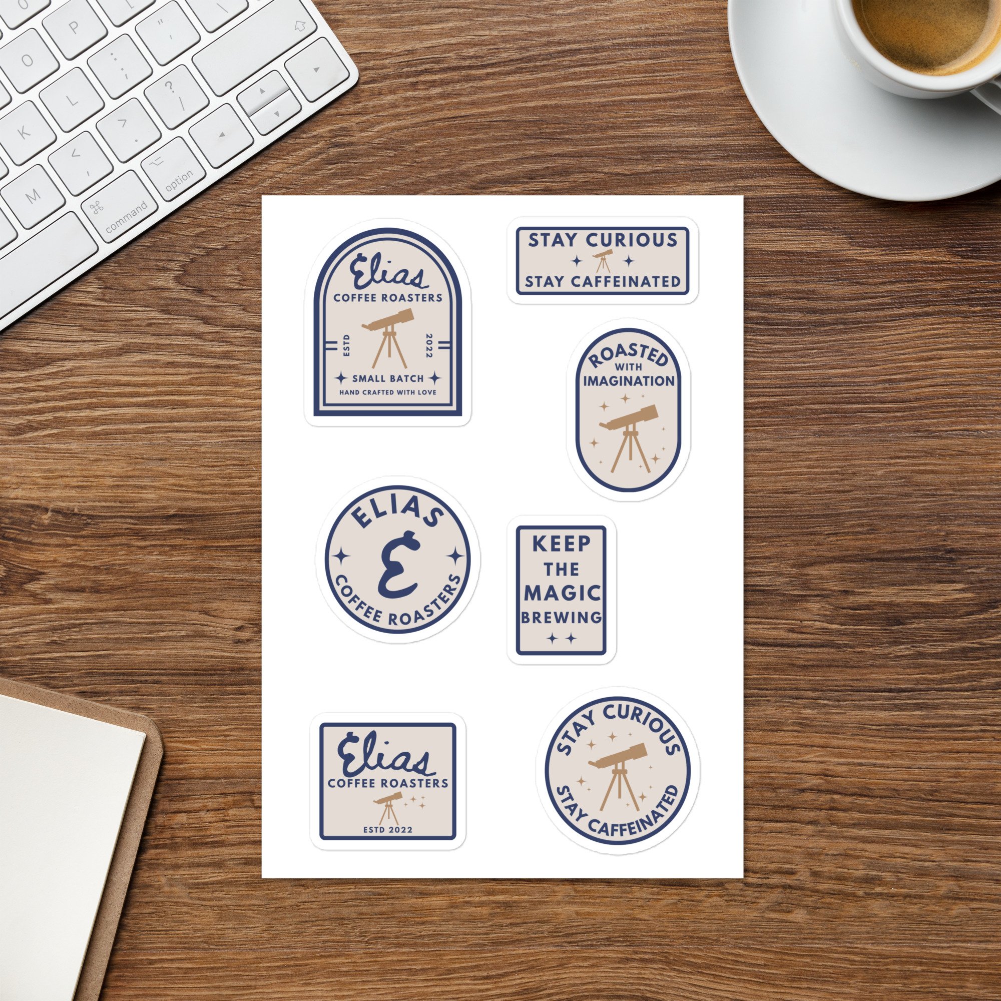7 glossy stickers designed for your laptop, travel coffee container, or notebook